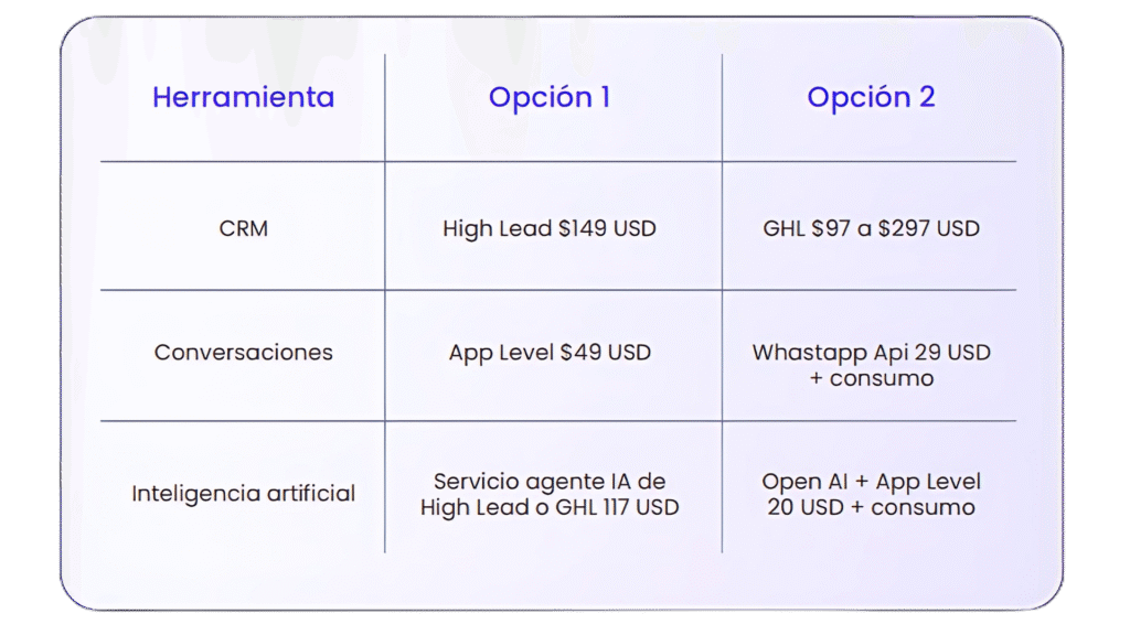 Nota: para estos servicios se requiere contar con la plataforma High Lead o Go High Level el pago por configuración es único y el pago a la herramienta usada es mensual el cliente lo adquiere de manera directa. puede adquirilo en www.highlead.us